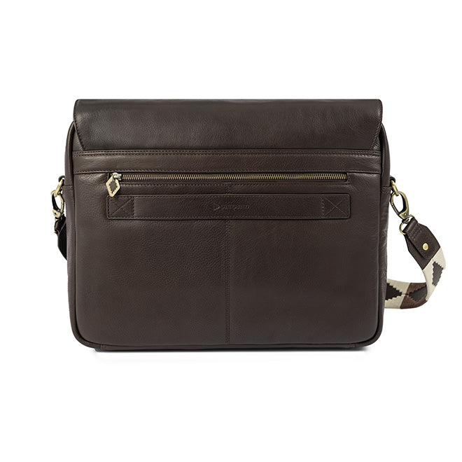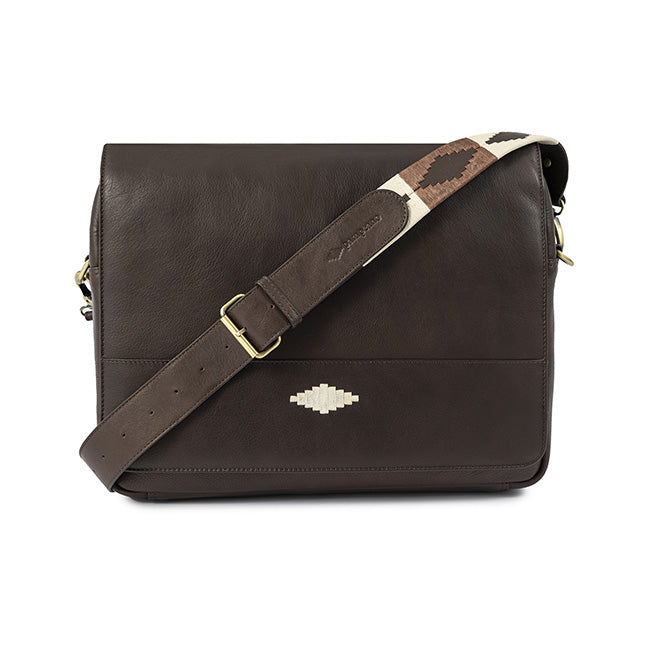 This premium men’s messenger bag features a classic flap cover with an impressive hand-embroidered motif. Holds up to 18" laptops in the main compartment and 14" laptops in the sleeve.