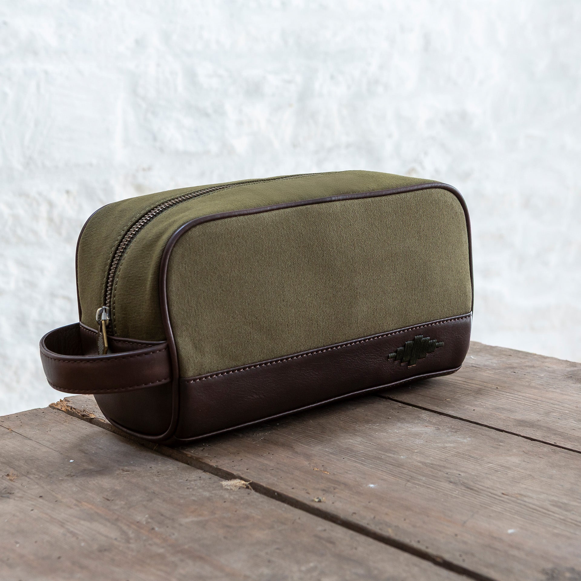 Hombre Washbag - Brown Leather and Forest Canvas with Dark Green Stitching