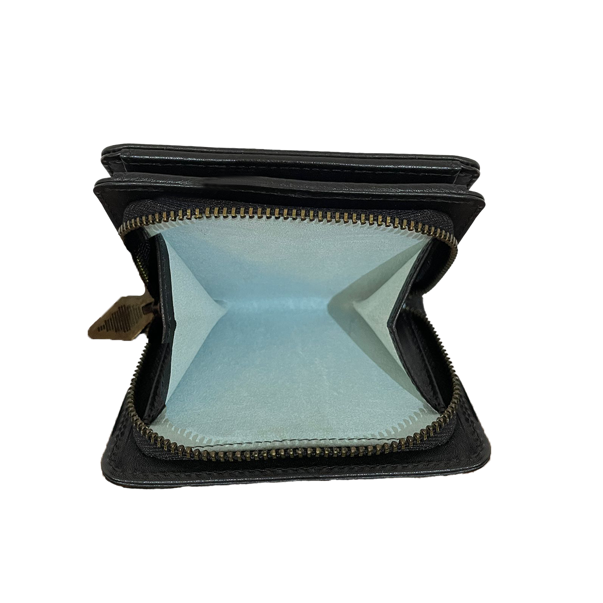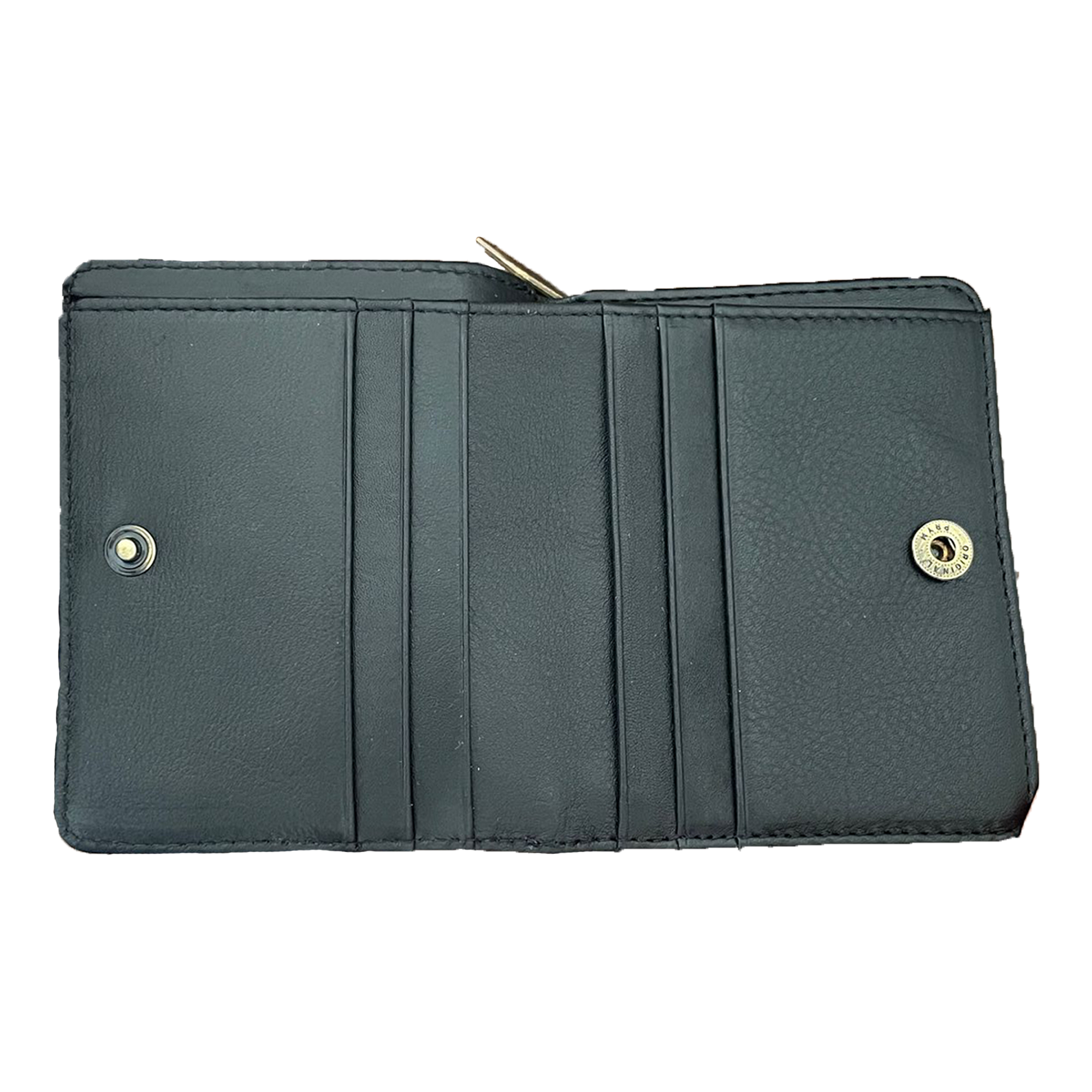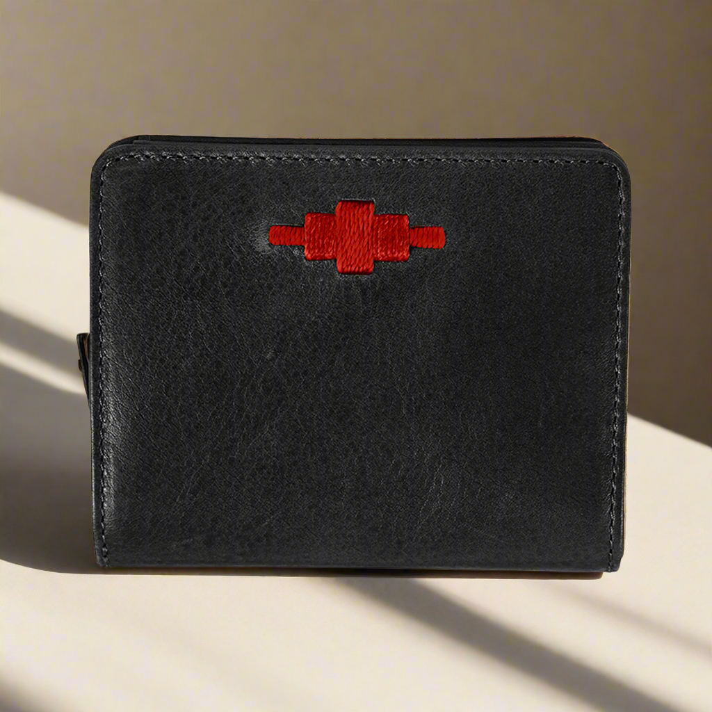 Add a sophisticated edge to your accessories with the Nena zipped purse in black leather, highlighted by burgundy stitching. With its compact design, measuring 10.5cm in length and 2.5cm in width, this purse offers a convenient zipped compartment for coins and six card slots for optimal organization.