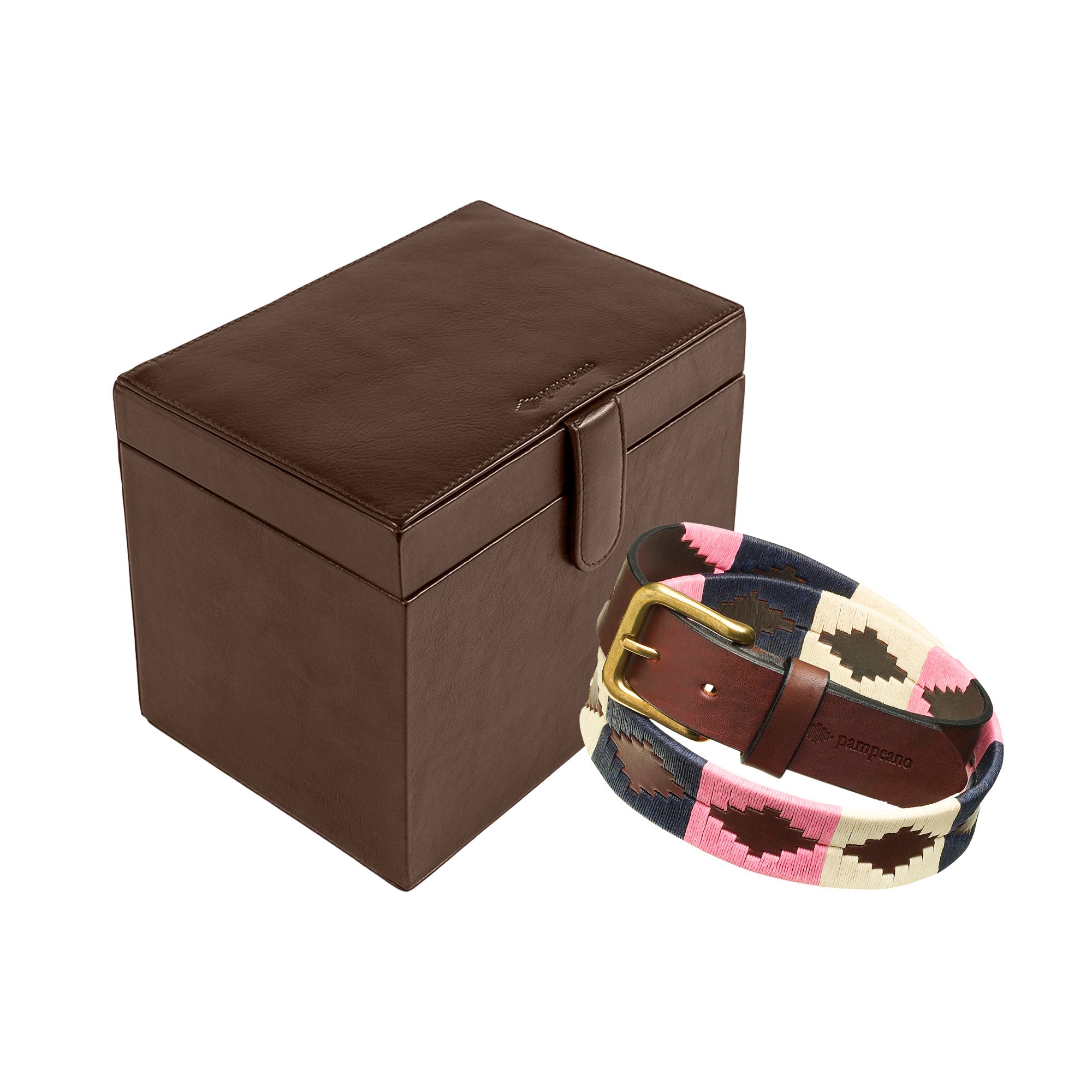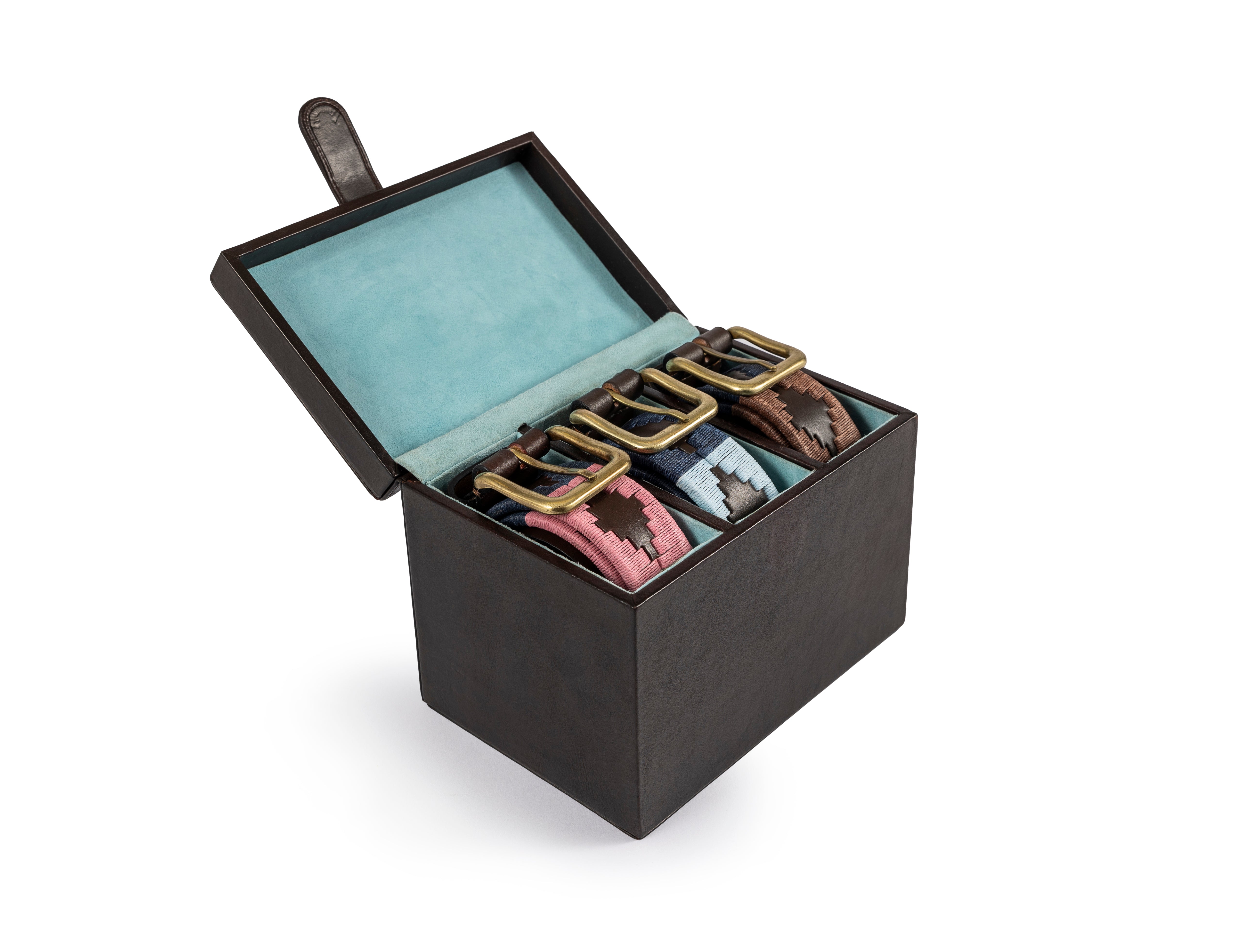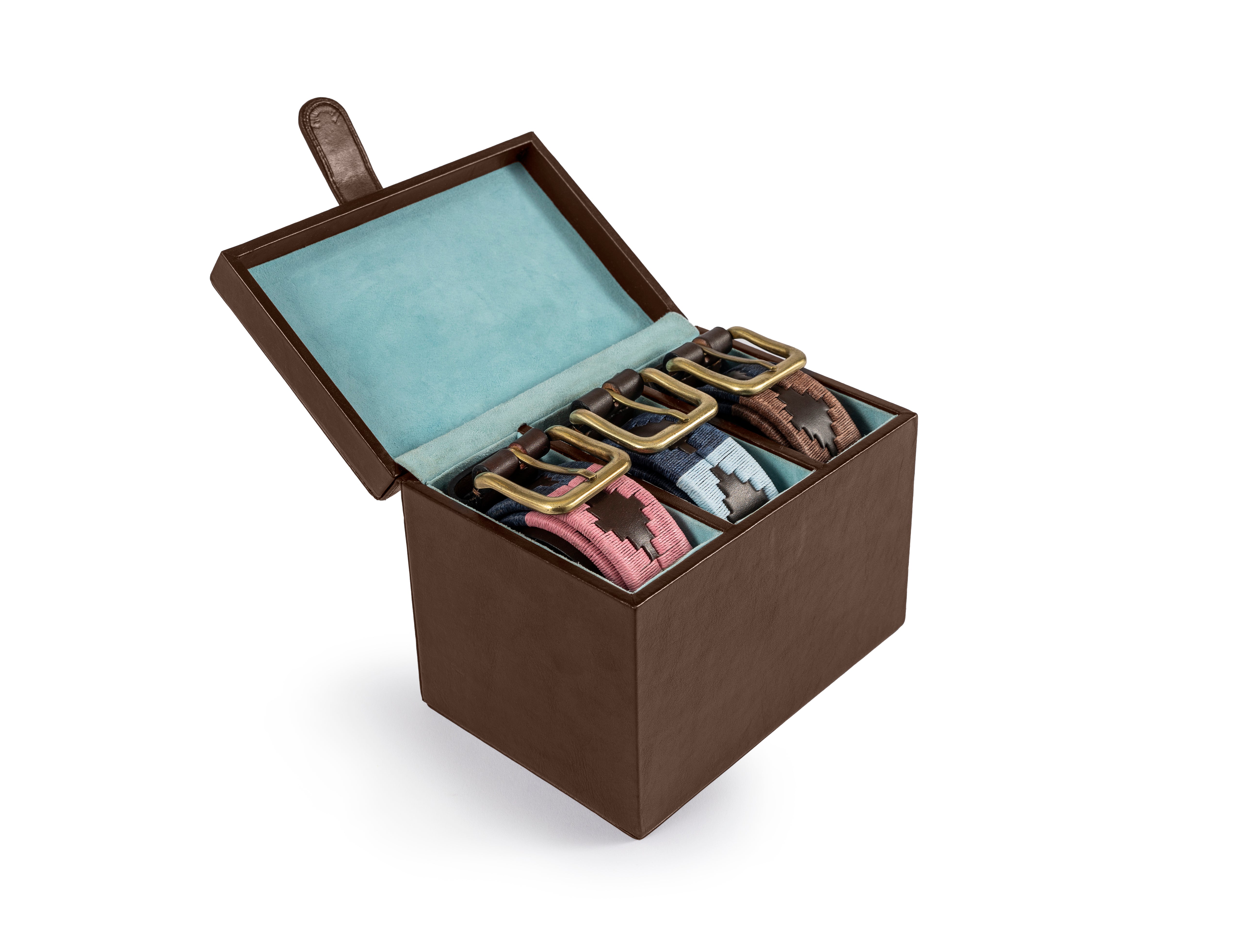 Explore our Leather Belt Box Bundle, available in tan, brown, or black leather. Expertly handcrafted from premium Argentine leather, this sophisticated box is designed to hold three pampeano belts, blending timeless style with lasting protection. The interior features a soft turquoise lining, beautifully contrasting the exterior while safeguarding your belts from scratches. Skilfully crafted by artisans, this elegant box is perfect for gifting or personal use, providing a secure and stylish way to store and display up to three belts.