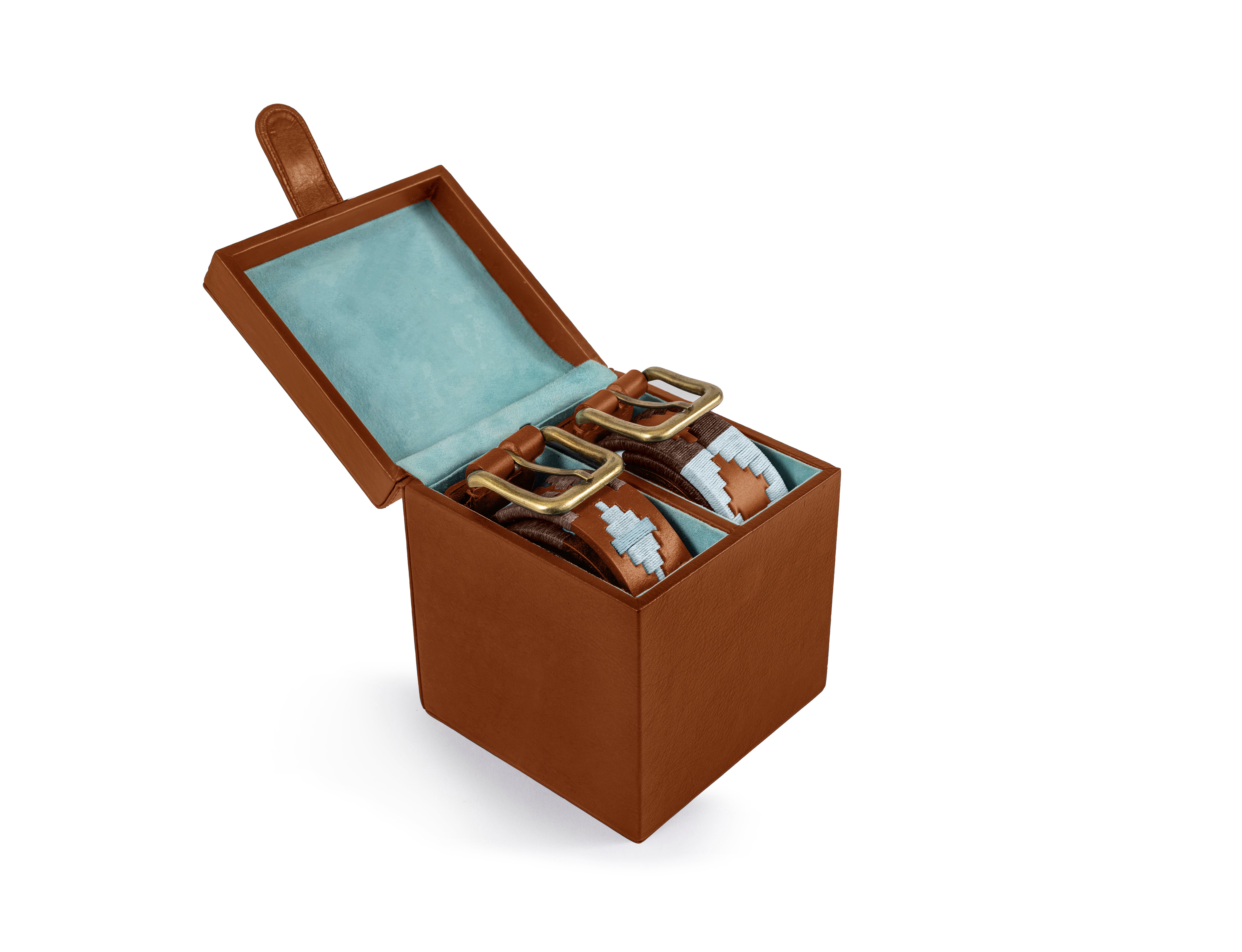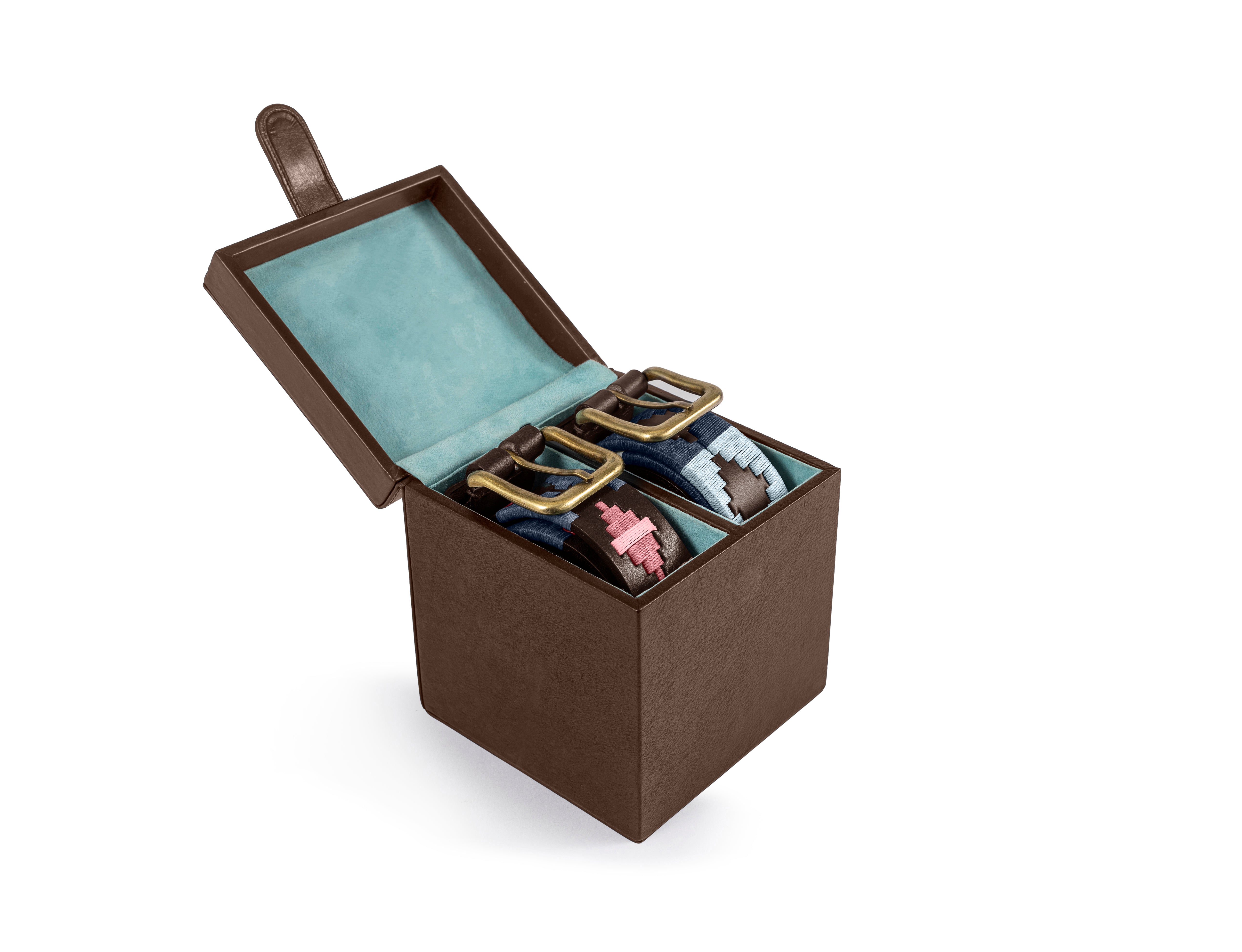 The box’s interior is lined with a soft turquoise, providing a stunning contrast to the exterior while safeguarding your belts from scratches. Meticulously crafted by skilled artisans, this versatile box is ideal for personal use or as a thoughtful gift.