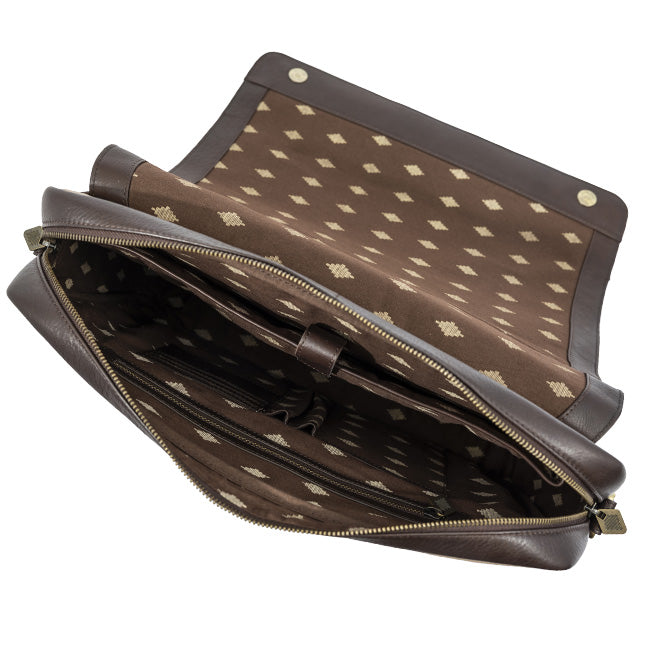This premium men’s messenger bag features a classic flap cover with an impressive hand-embroidered motif. Holds up to 18" laptops in the main compartment and 14" laptops in the sleeve.