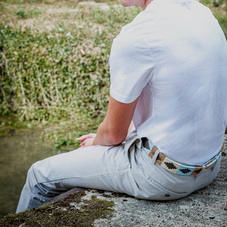 The Monte brown leather belt is a quietly striking design, inspired by soft, natural tones and subtle contrast meaning 'mountain'. Set on rich brown leather, its pampa pattern blends cream, light blue, and light brown threads for a look that feels balanced and considered. Versatile enough for both casual and more polished outfits, the Monte is a refined statement piece that reflects timeless craftsmanship with a modern, understated sensibility.