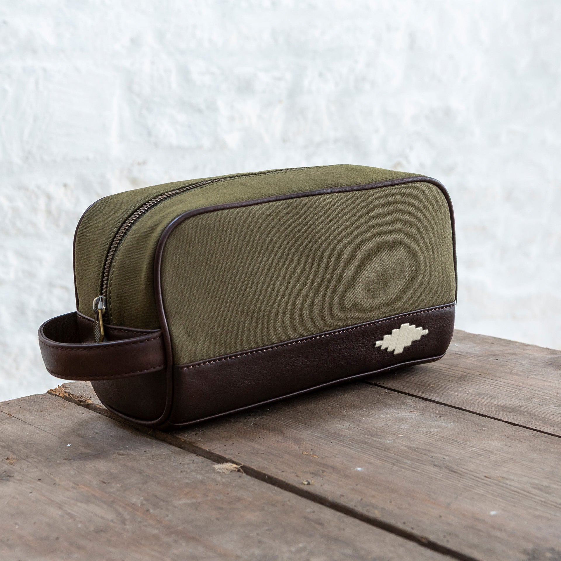 The washbag is made from buttery-soft Argentine leather, forest green canvas with a hand-stitched pampa diamond on the front made from wax-dipped saddlery threads.
