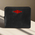 Verleihen Sie Ihren Accessoires mit der Nena Reißverschlusstasche aus schwarzem Leder mit burgunderfarbenen Nähten eine elegante Note. Mit ihrem kompakten Design (10,5 cm Länge und 2,5 cm Breite) bietet diese Tasche ein praktisches Reißverschlussfach für Münzen und sechs Kartenfächer für optimale Organisation.
