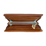 Echtes argentinisches Narbenleder, in Wachs getauchter Sattlerfaden, mit unserem ikonischen Rautenmotiv vernäht, und hellblaues Bandera-Wildlederfutter.