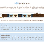 Die Pampeano-Pologürtel sind mit einigen Ausnahmen zwischen 80 und 115 cm lang. Jeder Gürtel hat die Standardbreite von 3,5 cm. Unsere schmalen Pampeano-Gürtel sind 2,5 cm breit und eignen sich perfekt für kleinere Gürtelschlaufen. Weitere Informationen finden Sie in unserer internationalen Größentabelle .