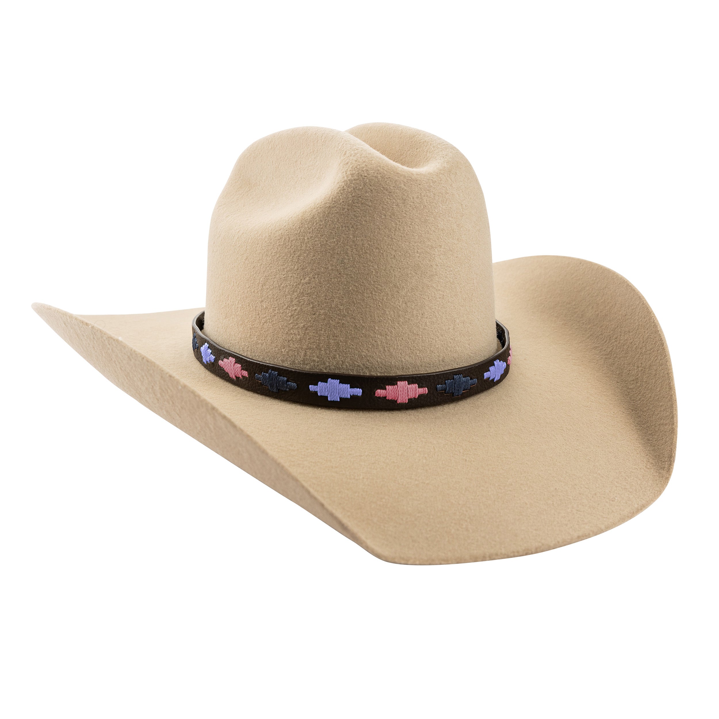 Verleihen Sie jedem Hut mit diesem brandneuen Premium-Hutband aus Leder von Pampeano eine natürliche Note. Handgenäht mit leuchtenden Fäden in Flieder, Marineblau und Pink, passt dieses Hutband, obwohl unisex, gut zu Damenhüten – zum Beispiel zu breitkrempigen Sonnenhüten oder auch zu klassischen Cowboyhüten. Das Hutband ist 55 cm lang, 1,5 cm breit und verfügt über eine verstellbare Lederkordel, sodass es auf jede Kopf- und Hutgröße passt.