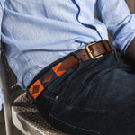 Ein ausdrucksstarker Gaucho-Gürtel in tiefem Marineblau und Terrakotta-Orange, sorgfältig handgewebt, um den Geist der argentinischen Pampa widerzuspiegeln. Individuelle Prägung möglich.