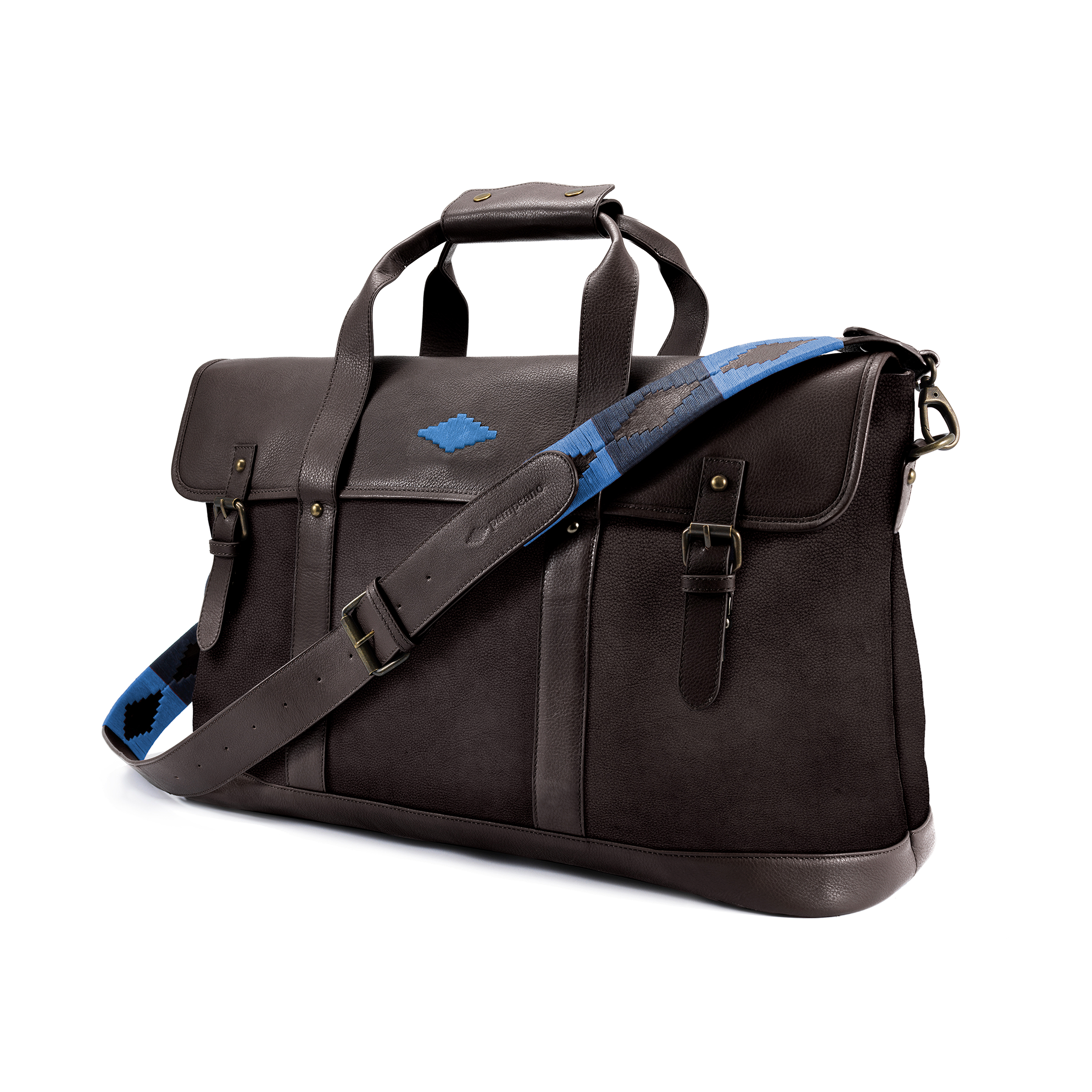 Der Pampa-Diamant, der die Escapada ziert, ist ein altes aztekisches Motiv, das die Anden repräsentiert. So können Sie Ihre Reiselust bei Ihrem nächsten Abenteuer mit Ihrem Gepäck zum Ausdruck bringen. Der Riemen ist austauschbar, sodass Sie Farbkombinationen kreieren können, die so einzigartig sind wie Sie selbst. Die Kombination aus Braun und Blau ist zeitlos und elegant und passt zu vielen Reiseoutfits.
