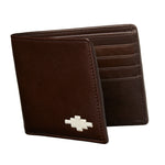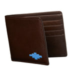 Auf die Vorderseite der Brieftasche wurde der ikonische Pampa-Diamant von Hand gestickt, der durch Pampeanos weltbekannte Pologürtel aus Leder berühmt wurde. Diese werden in Südamerika von echten Kunsthandwerkern in einem über vier Stunden dauernden Prozess von Hand genäht. Die in Wachs getauchten Sattlerfäden wurden in Pampeanos elegantem Creme und leuchtendem Blau ausgewählt und bilden einen kräftigen Kontrast zu dem warmen nussbraunen Leder. Diese Handnähtechnik ist eine traditionelle Praxis in Südamerika, die über Generationen von Kunsthandwerkern gelehrt und weitergegeben wurde und bis zum heutigen Tag nicht maschinell reproduziert werden kann. Nie zuvor wurde diese Methode anstelle des dicken, festen Leders der Pologürtel von Pampeano für Brieftaschen ausprobiert. Diese Dinero-Kartenbrieftasche ist ein echtes Stück Innovation und vereint südamerikanisches Erbe mit modernem britischem Design.
