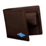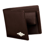 Das einzelne Pampa-Diamant-Motiv, das von Hand auf die Vorderseite dieser Brieftasche gestickt wurde, verleiht diesem beeindruckenden Stück zusätzlichen Glanz. Dies ist ein ikonisches und traditionelles Echtheitszeichen, das maschinell nicht reproduziert werden kann. Die leuchtenden, in Wachs getauchten Sattlerfäden sind dieselben, die für die weltberühmten Pologürtel von Pampeano verwendet werden und spiegeln die Gipfel und Silhouetten der Anden in Südamerika wider.