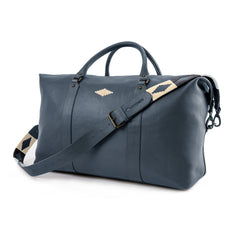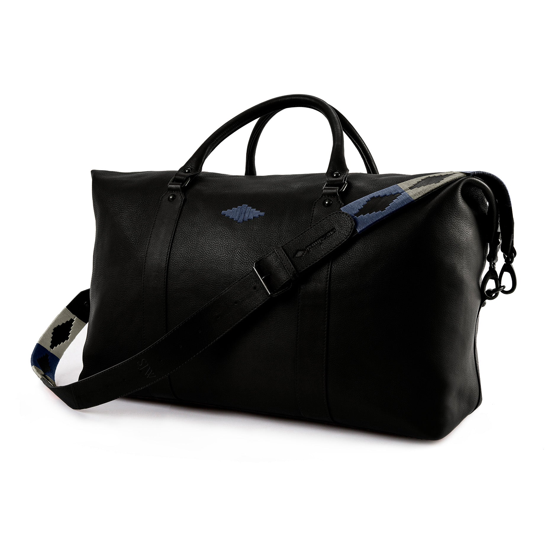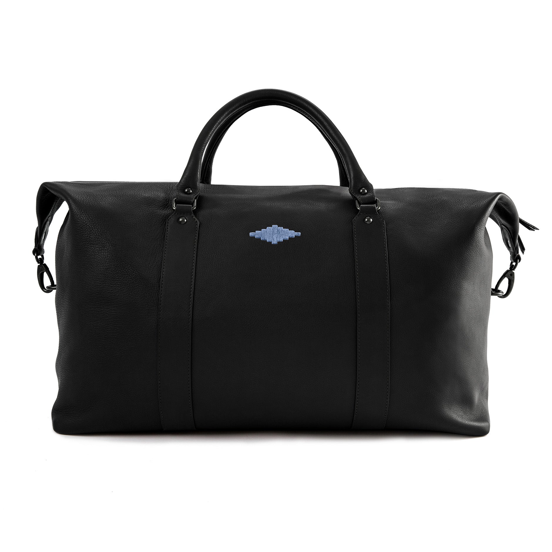 Eine zeitlose große Reisetasche aus schwarzem, pflanzlich gegerbtem Leder, akzentuiert mit marineblauen Pampa-Rautennähten. Ihr schlichtes Design und die anpassungsfähigen Funktionen machen sie zum idealen Reiseaccessoire für alle, die einen dezenten Stil bevorzugen.