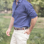 Ein schlichter brauner Ledergürtel für Herren mit einer dezenten Mischung aus marineblauen und braunen Webmustern. Die sich wiederholenden Pampa-Muster verleihen einen traditionellen Stil, der zu entspannter Eleganz passt.
