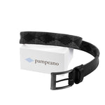 Et håndlaget svart skinnbelte for menn med delikate vevde detaljer og en klassisk silhuett. Utfyller både skreddersydde og avslappede antrekk.