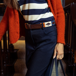Det brune skinnbeltet Aurora har et fantastisk design inspirert av fargene i en vakker daggry, og kombinerer delikate nyanser av oransje, marineblå og kremfarget. Aurora er perfekt for både uformelle og formelle antrekk, og er et ekte statement-plagg som forener tidløst håndverk og moderne stil.