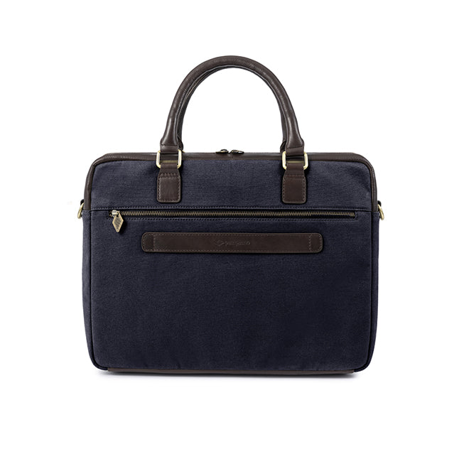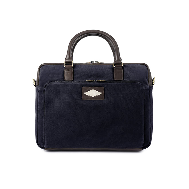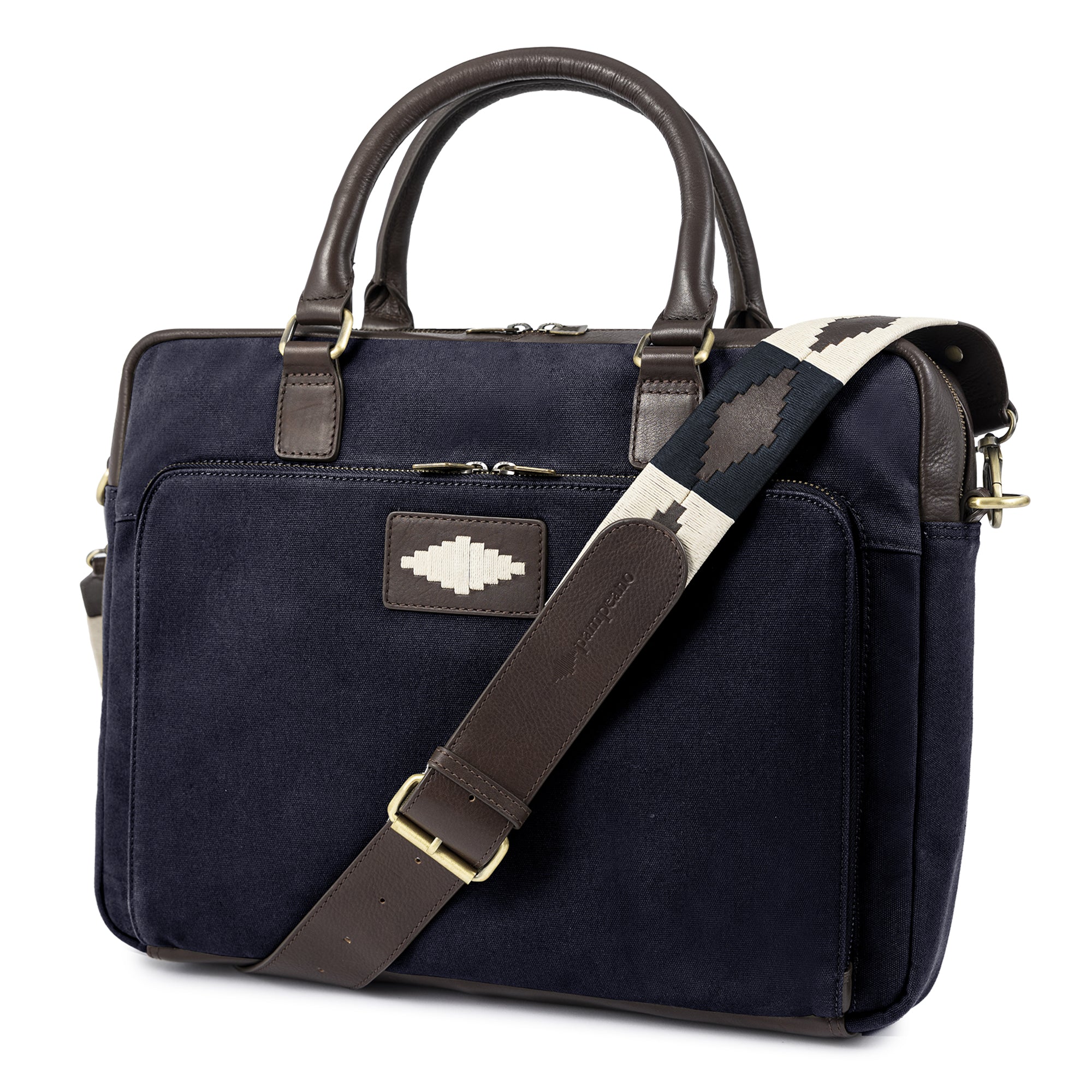 Denne laptop-vesken er laget av solid marineblått lerret og vegetabilsk garvet brunt skinn, og har et romslig interiør med et polstret rom som passer til den bærbare datamaskinen og dokumentene dine, mens diskré messingdetaljer gir stille raffinement. Det eneste synlige motivet – en kremfarget Pampa-diamant – er en hyllest til Argentinas fjellstillhet. Ingen høylytt merkevarebygging; bare håndverk og karakter.