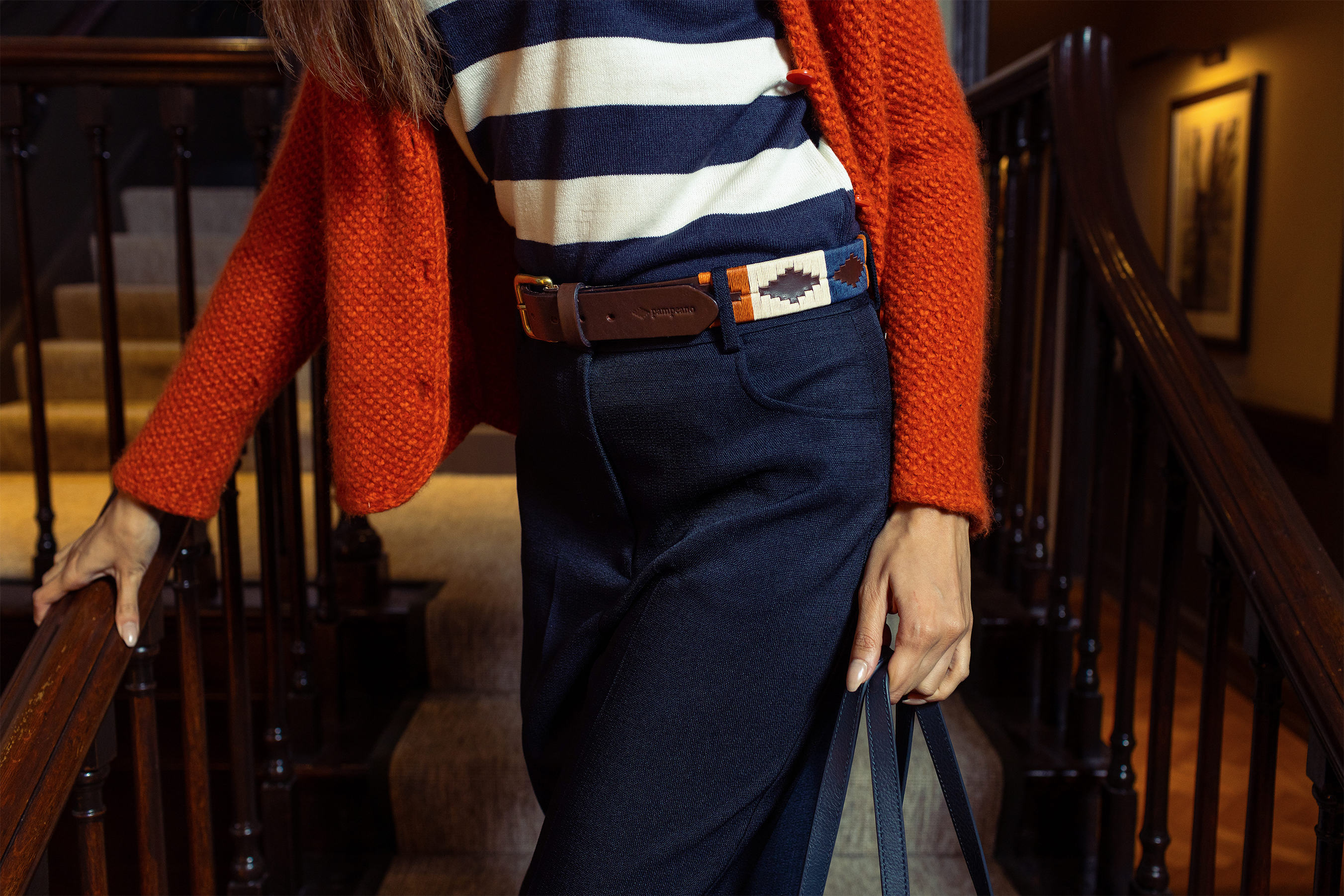 Det brune skinnbeltet Aurora har et fantastisk design inspirert av fargene i en vakker daggry, og kombinerer delikate nyanser av oransje, marineblå og kremfarget. Aurora er perfekt for både uformelle og formelle antrekk, og er et ekte statement-plagg som forener tidløst håndverk og moderne stil.