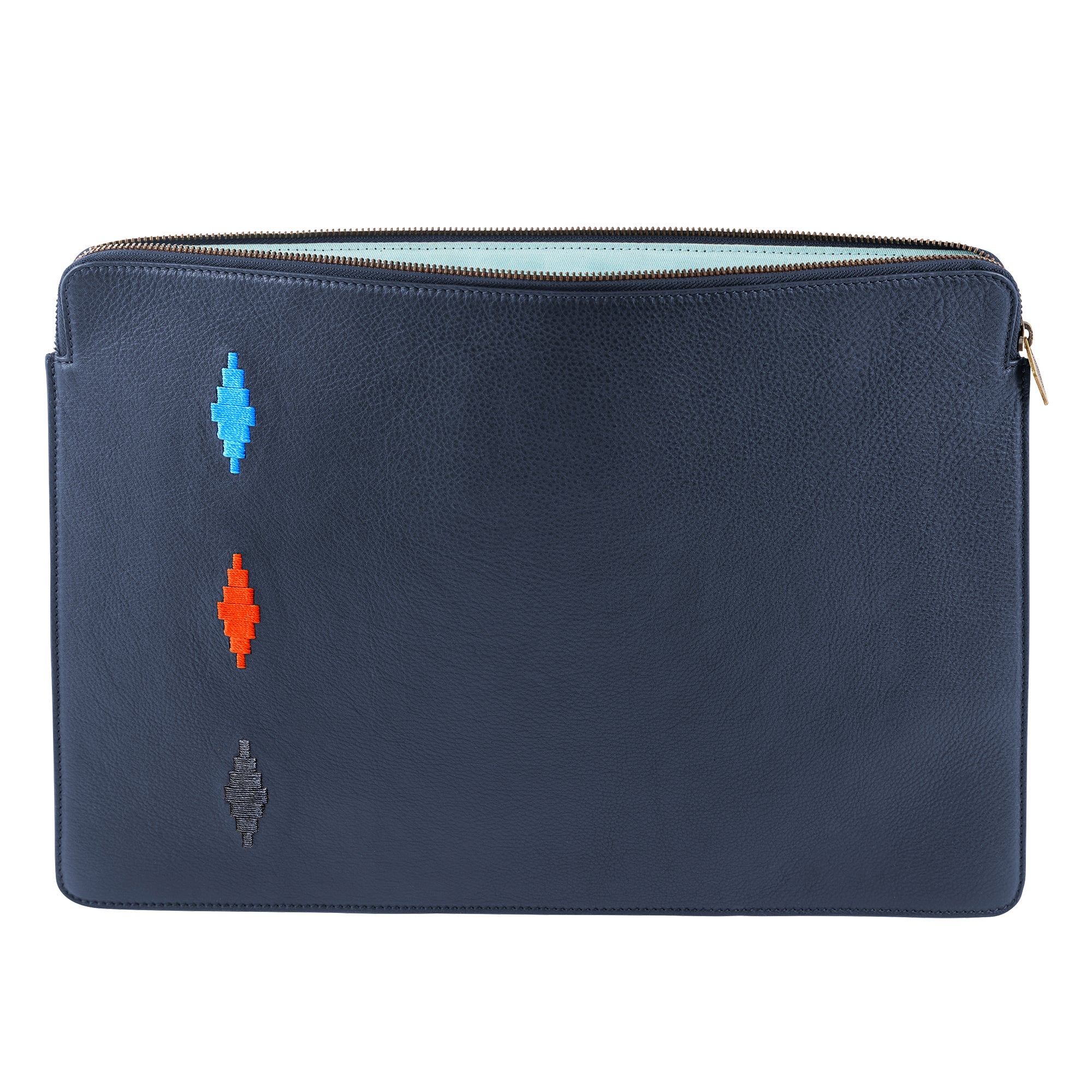 Profesjonelt utseende, gjennomtenkt i detaljene. Dette laptop-etuiet har taktilt marineblått skinn, håndverksmessig finish og subtile nikk til kulturarv.