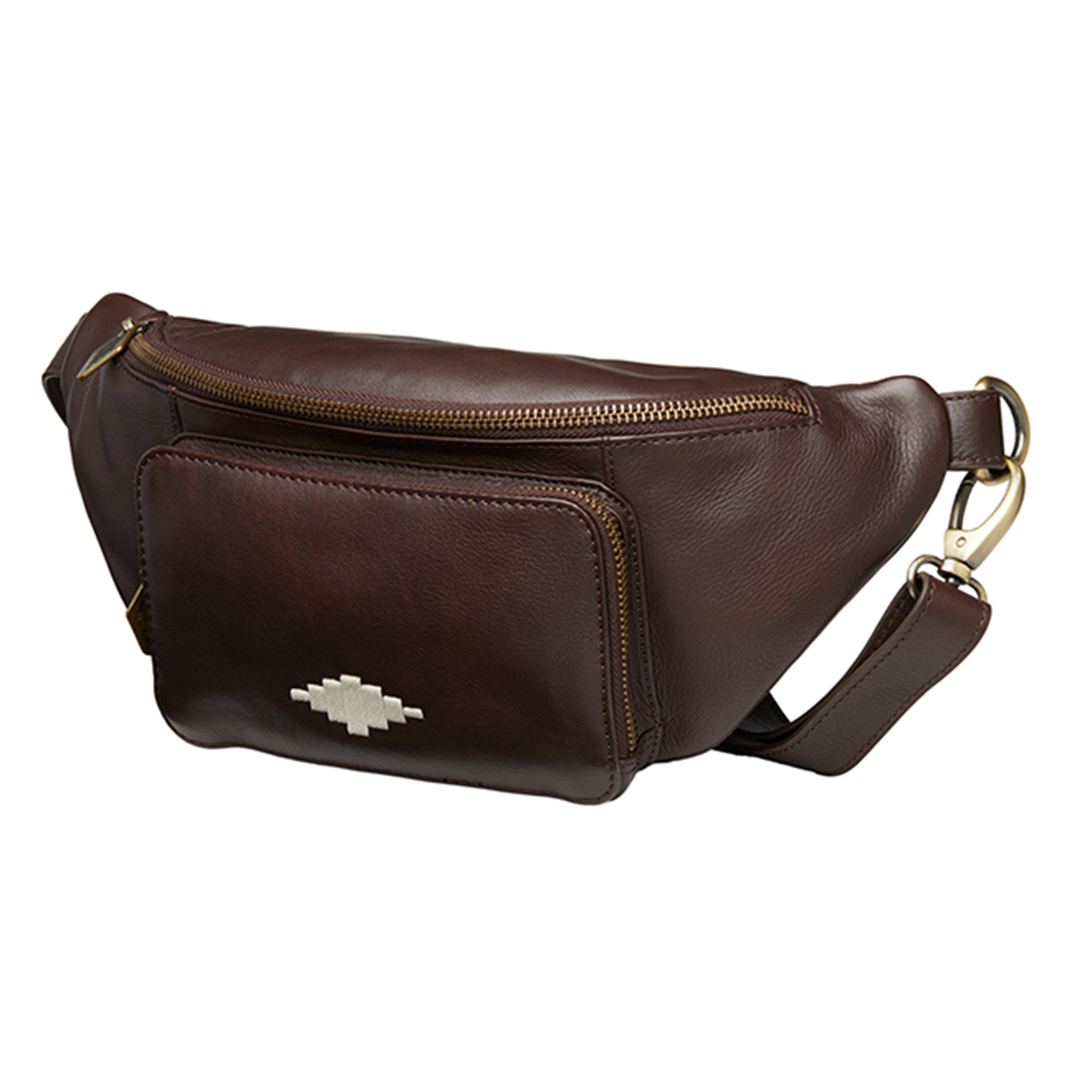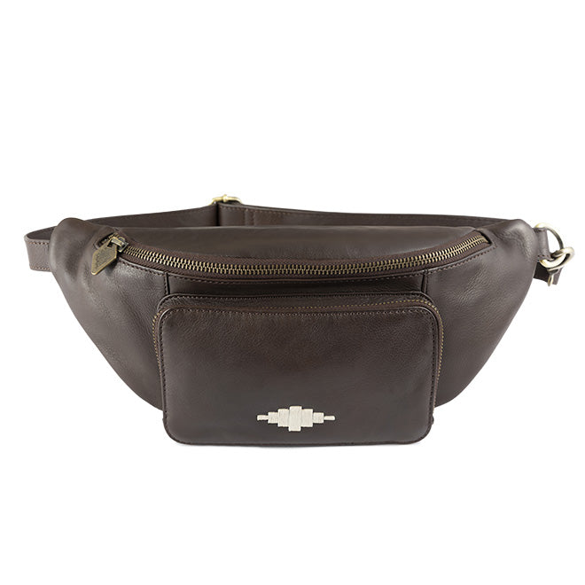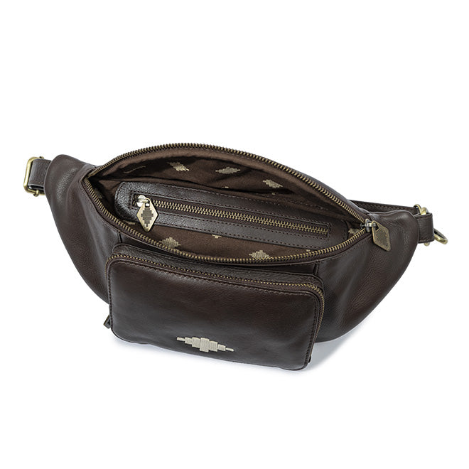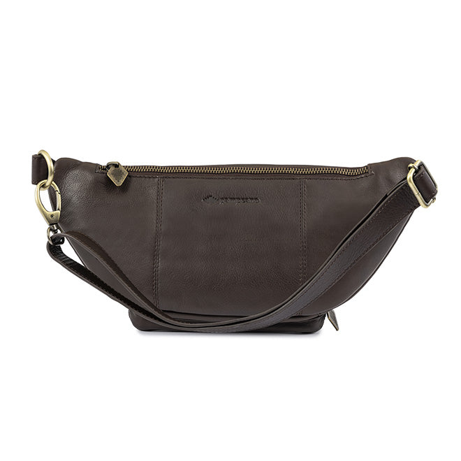 En brun skinnveske designet for å holde eiendelene dine sikret og hendene fri på byturer, reisedager eller den daglige pendlingen. Stroppen kan justeres for å sitte i midjen eller slynges over skulderen.